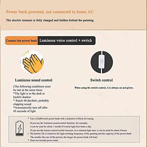 LED wanddecoratie schilderij 2 specificaties: aansluiten op netstroom en powerbank.Aangesloten op wisselstroom, zijn er twee bedieningsmodi: afstandsbediening en handmatige schakelaar.Aangesloten op de powerbank heeft twee bedieningsmodi: nachtgeluidsregeling en handmatige schakelaar, die aan verschillende behoeften kan voldoen.